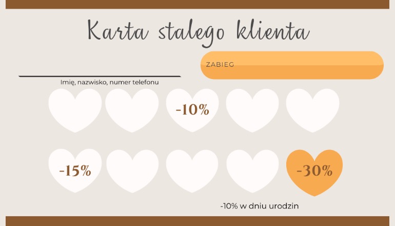 Przyjdź do naszego salonu, a otrzymasz kartę stałego klienta z wyjątkowymi zniżkami na zabiegi.